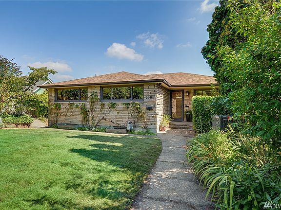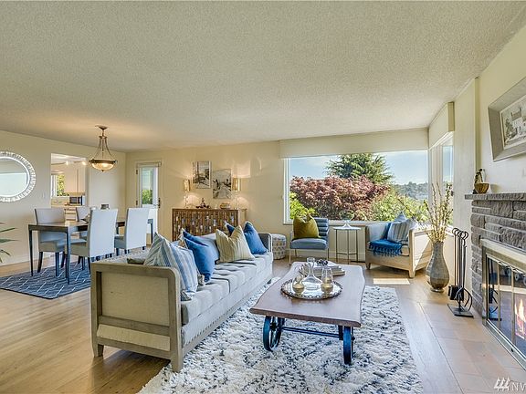 Terrific location! Magnolia SE bluff w/200* view of City, Mt. Rainier, Sound, even W Seattle! Great neighborhood w/top schools. Main floor features hardwoods, fireplace, 2 bdrms, full bath, kitchen & lovely deck w mature wisteria. Lower level has spacious family room w/view & fireplace; 2nd full kitchen; office; 3rd N/C bdrm; 3/4 bath. Attached garage & laundry lead to lush gardens. Energy-efficient gas furnace, central A/C equipped for expansion, recent Anderson windows, new roof.