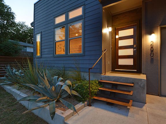 This modern home design by Verde Builders Group, built in 2012 is back on the market! This home is conveniently located 5 minutes from downtown in hip East Austin. It offers an attached one car garage, large entertaining deck, modern kitchen with stainless appliances and granite counter tops, tons of windows & natural light, state-of-the-art security and automation, outdoor fire pit, large fenced backyard, and modern accents throughout.