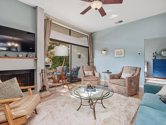 This turnkey 1-bedroom corner end unit on a quiet cul-de-sac is filled with natural light thanks to its abundance of windows. Thoughtfully upgraded throughout, the home features a spacious kitchen with a center island, gorgeous natural granite countertops, ceramic tile flooring, a rich brown quartz double-bowl sink, stainless steel appliances (including a double oven and refrigerator), a dedicated laundry closet with washer and dryer, ample counter space, and a large picture window. The pass-through bar opens to a generous dining area and a step-down living room appointed with a cozy fireplace, ceiling fan, luxury vinyl wood-plank flooring, recessed lighting, and sliding doors leading to a private patio. A custom barn door introduces the ensuite bedroom, which offers a ceiling fan and its own sliding doors to a large private patio—ideal for morning coffee or a quiet afternoon retreat. The ensuite bath includes a double vanity, tub/shower combo, and a spacious walk-in closet. A separate guest powder room adds additional convenience. With three outdoor patio spaces, you can truly embrace the quintessential SoCal indoor-outdoor lifestyle. Additional highlights include gated underground parking with a reserved space and storage. This Mediterranean-inspired community sits on the edge of the world-famous La Costa Resort, just 2.5 miles from the beach and moments from popular restaurants, shops, movie theaters, grocery stores, and direct access to I-5. HOA dues include water, trash, sewer, exterior maintenance, landscaping, and access to resort-style amenities—pool, spa, sauna, and tennis courts.