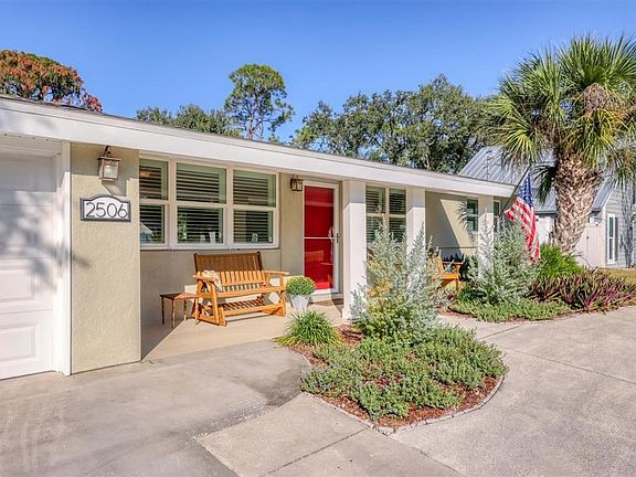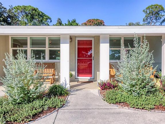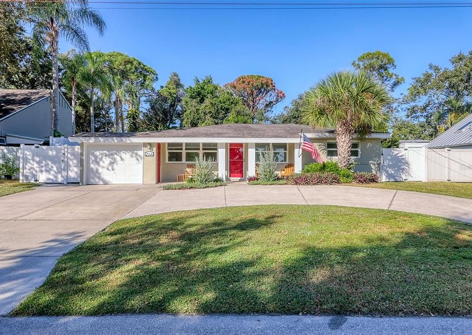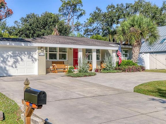 A circular drive welcomes you to this move-in ready home featuring tile and terrazzo flooring throughout. The kitchen offers new quartz countertops, stainless steel appliances, custom cabinetry, and a stylish glass tile backsplash. Both bathrooms are updated, and the windows were replaced and plantation shutters for added comfort and efficiency. Enjoy outdoor living on the large covered and screened lanai or in the sparkling inground pool. The fenced yard includes two sheds and a dog run—perfect for pets and gatherings. Additional updates include surge-protected electrical, roof (2014), AC (5 years old) and appliances (less than 10 years old). Inside laundry and garage with industrial sink, shelving, and bench seating. Conveniently located near shops, restaurants, the Legacy Trail., downtown Sarasota and Siesta Beach.