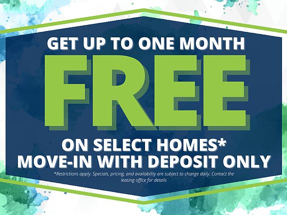 - Special offer! Up to One Month Free on select homes! Move-in with Deposit Only! *Restrictions apply. Specials, pricing and availability subject to change daily. Contact the leasing office for details.
