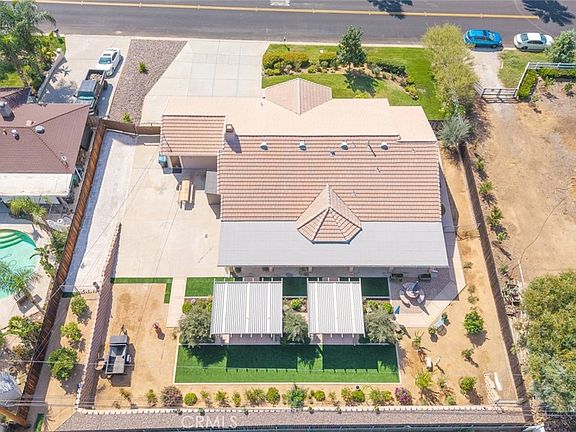 Welcome Home! This single story ranch style home is a rare find! Situated on a 27,442 square foot lot with gated oversized RV/boat parking. This home is stunning and immaculately maintained! Offering approximately 2,662 square feet 4 bedrooms and 3 bathrooms. Ceramic plank tiles (wood looking) throughout all main areas of the home. Oversized primary bedroom and bathroom that features dual sinks, stand alone shower and deep soaking tub, with a large walk in closet. Chefs dream of a kitchen, this expansive kitchen is great for family get togethers or entertaining! HUGE oversized island with bar seating, granite countertops, stainless steel appliances, and walk in pantry. The dining room is just off the kitchen, with all three spaces; Kitchen, dining and family room merging to create a massive open flowing space that works seamlessly together. Additional interior features include, ceiling fans, mirror wardrobes, high ceiling and gorgeous custom plantation shutters throughout and so much more. An individual indoor laundry room with cabinets. The backyard is just AMAZING with a patio cover that expands the full length of the home, and two individual free standing alumawood pergola's with ceiling fans. Artificial low maintenance grass, garden, fruit trees, (orange, lime, lemon, avocado, all fruit bearing trees and a private gated dog run! For those with an adventurous spirit, the property includes dedicated RV parking, ensuring your travel-ready vehicle has a secure spot. Still more room to. add a boat or more toys and or work vehicles. The exterior of the home has just been repainted! Low taxes and no HOA. This home is a rare find, move in ready and so well cared for it feels new! Don’t Miss Out! This home will sell fast.