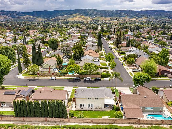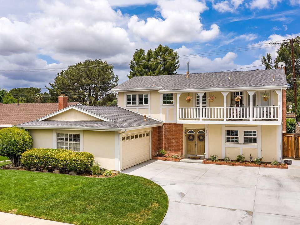 Welcome to this wonderful Kingspark 2-Story central Simi Valley home showing pride of ownership and featuring 4 bedrooms, 2.5 bathrooms, 1,957 sq. ft. of living space and sitting on a landscaped 6,500 sq. ft. lot with grassy yards, a back covered patio, an above ground spa, a corner tiered paver patio with a fountain, a 2-car garage with a workbench, laundry hookups and more! The lower level has wood flooring, French doors, a wet bar, a powder room, a living/dining room with a striking wall-to-wall fireplace, a family room and breakfast nook open to the kitchen hosting dual breakfast bars, a wide window over the sink, a 5-burner gas range, an oven and more. Moving to the upper floor, you are greeted with 3 secondary bedrooms, an updated hall bathroom, linen closets, and an inviting master bedroom with an updated bathroom and French doors to a front balcony. Other fine features include dual paned windows, ceiling fans in every room, a double door entry with leaded glass, a whole house fan, automatic sprinklers in front and back, and dual climate control. Convenient to great schools, parks, shopping, restaurants and just a short distance to the 118 Fwy. for the commuter. Wow!