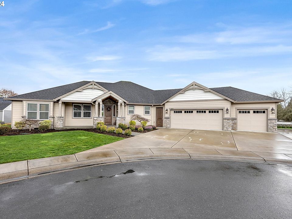 BEAUTIFUL ONE LEVEL RANCH HOME! 2568 Sq Ft home with 3 bedroom & office has an oversized 3 car garage, RV parking on 14,810 Sq ft lot that backs up to a green space. This amazing custom built home features 8ft doors throughout, no step front door entry, open concept, wide hallways, monarch wide plank flooring, built-in 5 burner gas cook top, built-in oven & microwave, stainless steel appliances, quartz countertops, full height tile backsplash, soft close cabinet drawers & doors, kitchen island, instant hot water, walk-in pantry with built-in work station inside the pantry, gas fireplace with stone surround, built-in cabinets, vaulted beam ceiling, office, Jack & Jill bathroom, tile mud set roll-in shower, soaking tub, double vanity sinks, coffered ceiling with rope lighting, primary bedroom walk-in closet with pass through to laundry room, mudroom sink with built-in cabinets & extra storage throughout the home. Smart garage door openers, tongue and groove vaulted covered patio, gas stub for BBQ, concrete pathway, outdoor stone fireplace, pergola, garden boxes, landscaped front and back yard & so much more! This home is built with superior craftsmanship and meticulous attention to detail! MUST SEE!