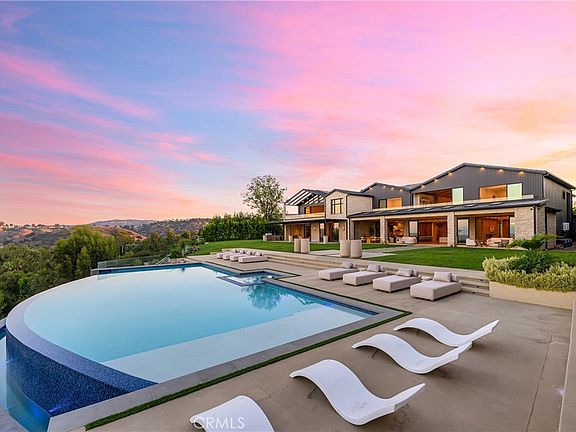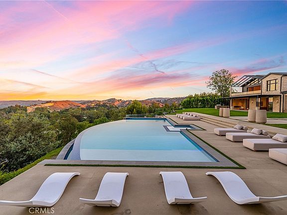 Perched on a pristine 1.6-acre lot in the prestigious Ashley Ridge enclave of Hidden Hills, this newly constructed estate is a masterpiece of modern luxury and design. From the moment you step through the custom front door, you're welcomed into a world of refined elegance. A breathtaking two-story foyer crowned by a full glass ceiling floods the interior with natural light, setting the stage for the home's extraordinary ambiance. The expansive open floor plan is designed for both grand entertaining and effortless daily living. At its heart is a chef’s dream kitchen featuring a large center island with counter seating, a spacious breakfast area, and an adjoining butler’s pantry equipped with a separate catering kitchen. The kitchen flows seamlessly into a spectacular great room with sliding glass walls, a two-sided fireplace, and an adjacent living lounge complete with a stylish seating bar and a glass-enclosed, temperature-controlled wine display. Additional highlights include a formal dining room, a sunlit private office with picture windows, a state-of-the-art home theater with acoustic fabric walls, a large game room, and an oversized gym and spa area featuring a steam shower and sauna. Upstairs, a dramatic vaulted den with open-beam ceilings and a full wall of glass overlooks the beautifully landscaped grounds. With six generous en suite bedrooms—two on the main level and four upstairs—this home offers both comfort and privacy. The opulent primary suite is a true sanctuary, complete with a fireplace, two luxurious bathrooms (each with a soaking tub), custom walk-in dressing rooms, and a private balcony showcasing sweeping views of the city lights and rolling hills. The resort-style backyard is equally impressive, featuring a stunning zero-edge infinity pool and spa, over 2,000 square feet of covered outdoor living space with a fireplace and full barbecue kitchen, and expansive lawn areas perfect for recreation or entertaining. This trophy estate delivers a rare blend of architectural brilliance, top-tier amenities, and an unbeatable location on one of Hidden Hills' most coveted streets.