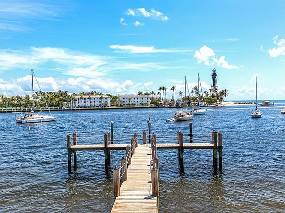 First Floor unit with Spectacular Waterfront Views of Hillsboro Lighthouse / Inlet & Atlantic Ocean! Stunning Balcony Sunsets on private porch. Private Sandy Beach access.1 block to water taxi, charter fishing/scuba/snorkling fleets & restaurants. Community pools, shuffle board, laundry facilities. Thoughtfully-designed 1,142-sq. foot layout w/ open-concept living area. Natural light flows into kitchen/dining space. This space is perfect for relaxing evenings and entertaining. Fully-equipped kitchen includes all necessary appliances, essential cookware, utensils. Choose between a large countertop with barstools where you can share morning coffee or casual meals or go alfresco on the waterfront patio. King master w/ panoramic water views. All utilities included except cable and internet.