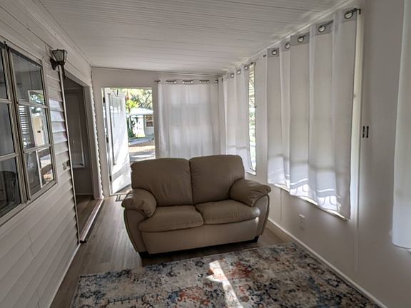 Welcome to your new home in Chulavista Landings, a highly sought-after 55+ community! This one-bedroom, one-bathroom gem is packed with recent upgrades and thoughtful features, making it a perfect, move-in-ready retreat. Step inside to an open-concept layout that seamlessly connects the spacious living room and kitchen, all featuring beautiful, new laminate wood flooring and subfloors. The kitchen comes equipped with all appliances, while a separate washer and dryer hookup adds convenience. A brand new central air unit ensures year-round comfort, and the newer shingled roof provides peace of mind. One of the standout features of this home is its accessibility, with a convenient wheelchair ramp leading to the entrance. You'll love the expansive, attached Florida room-the perfect spot to relax and enjoy the serene outdoor surroundings. The back yard offers a shaded oasis, where you can unwind while overlooking a peaceful stream. Storage is no issue thanks to the large 8x16 detached shed. The home is also being sold partially furnished, so you can move in and start enjoying the good life right away. The community amenities at Chulavista Landings are second to none. Your monthly lot rent of $716 includes water, sewer, trash, Wi-Fi, and cable. Residents have access to a sparkling pool, fitness center, library, fire pit, and a boat ramp with 30 slips. Enjoy an active lifestyle with pickleball and shuffleboard courts, or socialize at the large clubhouse with daily scheduled activities, including bingo, dances, and casino trips. The community is pet-friendly, welcoming two small furry friends. This home is perfectly situated for convenience, just 5-10 minutes from shopping, dining, and medical facilities. It's also a short 20-30 minute drive to both Tampa and St. Petersburg airports and 25-30 minutes from the beautiful beaches of St. Petersburg, Bradenton, and Anna Maria Island. This charming home won't last long-schedule your showing today! All listing information is deemed reliable but not guaranteed and should be independently verified through personal inspection by appropriate professionals. Integrity Mobile Home Sales cannot guarantee or warrant the accuracy of this information, measurements or condition of any property. Measurements are approximate. Lot rent is subject to change.