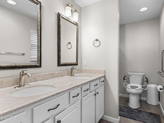 The master bathroom is a retreat of its own, equipped with a handicap-accessible shower featuring a teak seat, custom shelving, grab bars, and a shower wand. The ADA-compliant chair-height toilet with grab bars adds to the home's accessibility.