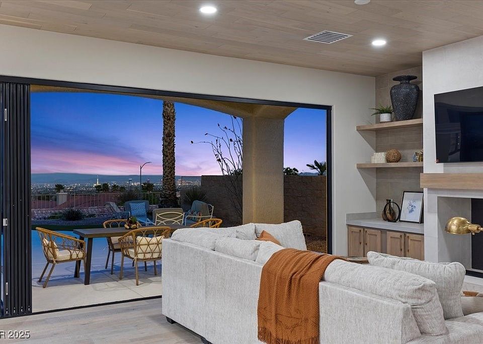 Premium design meets the ultimate 55+ lifestyle in this stunning Sun City Summerlin home. Enjoy iconic Strip views from the primary suite, kitchen, family room & backyard, while the front of the home captures breathtaking desert sunsets. Every detail has been thoughtfully curated, from the modern water-vapor fireplace & premium white oak engineered hardwood floors to custom wood-accent ceilings & designer walls that elevate the style throughout. At the heart of the home, the chef’s kitchen is a true showpiece with a spacious island, sleek quartz counters & open layout—perfect for entertaining or relaxing. A 15-ft panoramic sliding door of individual panels creates seamless indoor/outdoor living with twinkling city lights as your backdrop. Sun City Summerlin offers world-class amenities: 4 clubhouses, 3 golf courses, fitness center, pools, pickleball, social clubs & more. With shopping, dining & freeway access nearby, this home delivers the best of Las Vegas living.