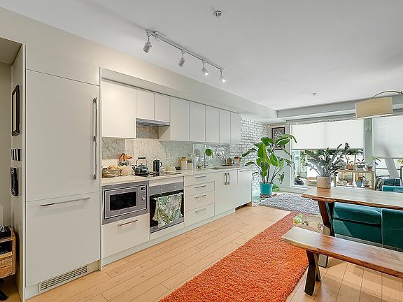 Welcome to Midtown Central by the Peterson Group/PortLiving (Studio Living).This boutique 33-unit building is perfectly located along the Broadway Corridor & Fraser Street. Situated on the quiet side of the complex features a spacious 208 sq ft patio, unobstructed. Enjoy high-end finishes throughout, including oak engineered hardwood floors, integrated appliances with induction cooktop, Carrera marble backsplash, and a luxurious bathroom with in-floor heated herringbone tile and a rain shower. The large walk-in closet doubles as a home office or flex space. Steps to shopping, restaurants, and the future Broadway Subway Station, this home is perfect for first-time buyers or investors looking for a move-in-ready property. Comes with parking, locker & bike locker.