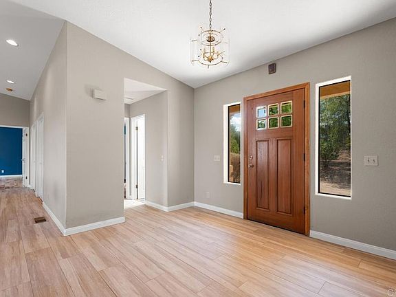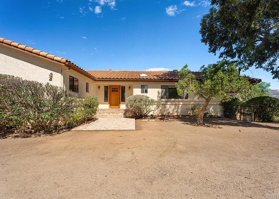 Welcome to this expansive and thoughtfully designed estate, offering comfort, functionality, and true country living with modern conveniences. Nestled in the back of the San Diego Country Estates, this property provides peace and privacy while still being close to community amenities, schools, and freeway access. Step inside to soaring ceilings and a spacious living room anchored by a wood-burning stove with gas start. The open layout flows seamlessly to a large family/dining room area, an open kitchen with large pantry area, and a private office with elegant acacia floors and a half bath. The primary suite is a true retreat, featuring two large closets with built-in organizers, real wood floors, and a luxurious bath with double sinks, walk-in shower, and soaking tub. A private slider leads you to the backyard oasis with hot tub and wraparound deck to enjoy the sweeping views. Two additional guest bedrooms with large closets share a full bath with dual sinks and separate shower/tub area. A spacious laundry room offers abundant storage, cabinetry, and a gas dryer connection. Energy efficiency and convenience are built in with central heat and zoned A/C (three zones), whole-house fan, EV charging station, whole-house RO and soft water system, and 48 paid solar panels with inverters in the garage. The three-car garage also provides ample space, while the basement includes a semi-finished bonus room in addition to a large air-conditioned area that can be finished for additional living space, wine cellar, craft room, etc. Outdoors, the property is a true homesteader’s dream with abundant fruit trees including citrus, peach, nectarine, apple, macadamia, blood orange, and grapefruit. The grounds feature a 12-station irrigation system, two outbuildings, a walk-in henhouse, corrals, a horse wash rack with power and water, and a tack room with electricity. Gardeners will love the automatic-timed garden irrigation. Additional upgrades include a 350-gallon propane tank, and a newer 10,000-gallon water tank with liner and pressure pump. With an electric gate to the garage, wraparound deck for entertaining, and plenty of space to live, work, and play, this property offers the best of rural living with modern luxuries.