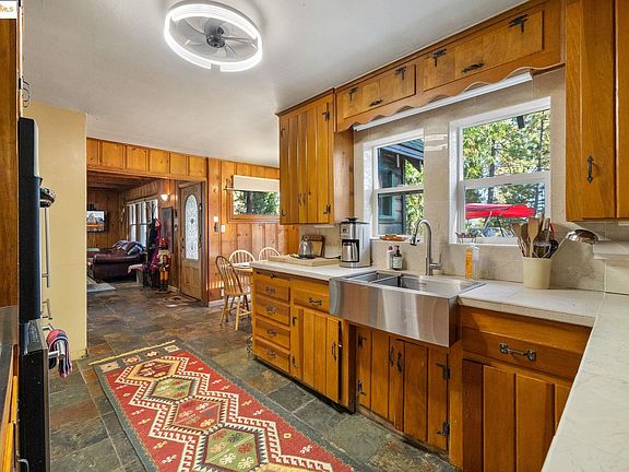 Timeless woodworkTall forest viewsTall pinesDiverse kitchenAmple cabinetryPicturesque windowsFarm-style sink