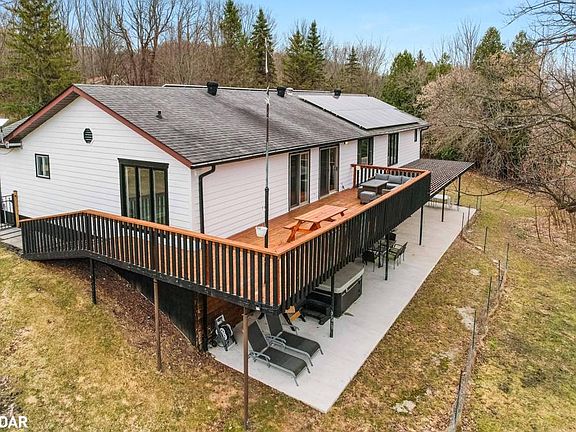 Private, Peaceful, and Just 15 Minutes from the City. Welcome to 2509 George Johnston Road where nature meets convenience on 3.5 acres of treed privacy in Springwater's sought-after Snow Valley community. This beautifully updated bungalow offers the best of both worlds: quick access to Barrie, while immersing you in a lifestyle of space, serenity, and recreation. Step inside to an open-concept main floor that blends modern finishes with warmth and functionality. The bright kitchen flows effortlessly into the dining and family rooms, framed by large windows and views of your own private forest. With four bedrooms, three full bathrooms, and a finished walkout basement with bar and rec room, there's room here for family, guests, or a multi-generational setup. Enjoy the comfort of a spacious primary suite with a walk-in dressing room and a 3- piece ensuite. Main floor laundry, a cozy fireplace, and a large wraparound deck with hot tub elevate everyday living. Outdoors, the property is a haven for all seasons hike or snowmobile through your own wooded trails, or head to nearby skiing, golfing, or biking routes. Your'e minutes from farm-to-table shops, golf courses, and outdoor adventures, yet only a short drive to city conveniences. With solar panels offsetting your energy costs, and room to roam, this is a home that balances smart living with natural beauty.
