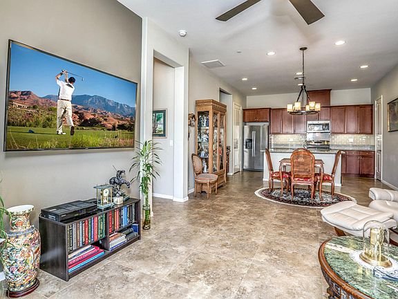 Welcome home to Villa Portofino, The Desert's premier 55 or better community located in the heart of Palm Desert. You are going to fall in love with this 2015 constructed 2 bdrm, 2 bath with 2 car tandem garage. Upgraded tile floors, slab granite counters, upgraded backsplash, additional recessed lighting and up lighting above cabinets, front loading washer and dryer, designer paint and window coverings, an extra deep garage that includes an approximate additional ten feet of storage or workspace area. You will love your electric bill with the owned Solar panels that the HOA maintains. Villa Portofino has a 32k square foot clubhouse with pool, bistro, movie theater, bridge room, concierge, yoga studio, fine dining and more.
