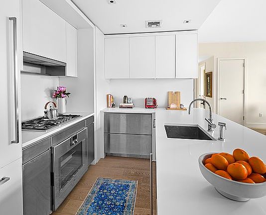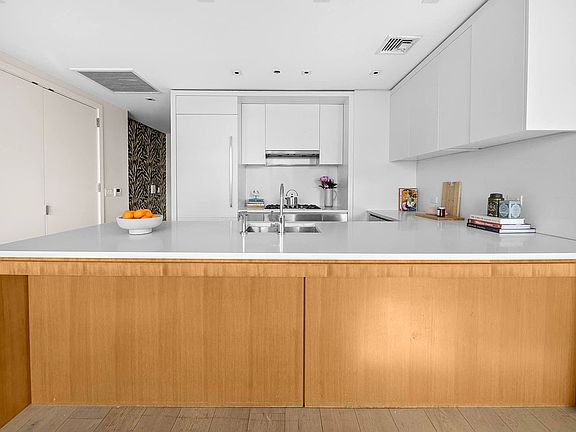 An entry gallery leads into an expansive great room anchored by a custom chef's kitchen with satin-lacquer cabinetry, stainless steel lower cabinets, an Anegre wood island with pure white Caesarstone, and a suite of Gaggenau appliances. The generous proportions of the living/dining area allow for the seamless creation of a full third bedroom with a closet while still preserving a comfortable, open living space-making this one of the building's most versatile floor plans.