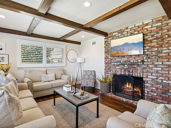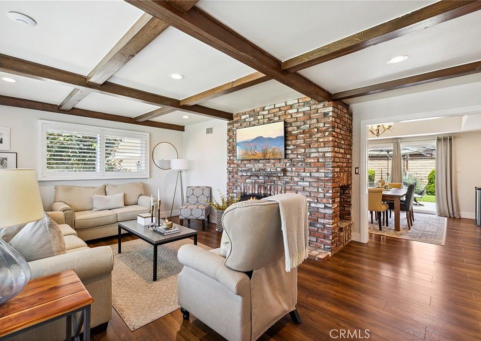 EXQUISITE 3 BEDROOM REMODELED SINGLE STORY HOME ~ A lot of thought went into the remodel of this home giving it a fresh and tasteful modern feel ~ Formal living room radiates hospitality and charm with large picture windows, beamed ceiling, recessed lighting and a dramatic brick fireplace ~ Dining room features high vaulted ceilings and a sliding door to the back yard ~ Remodeled kitchen with quartz counters, soft closing drawers, stainless appliances, range hood, mocha colored cabinetry and convenient breakfast bar ~ Spacious master suite with dual closets and a remodeled bathroom with walk in shower ~ Additional bedrooms are ample in size and share a remodeled hall bathroom with tub and dual sinks ~ Chic and stylish upgrades include engineered wood flooring, upgraded baseboards, solid paneled interior doors, plantation shutters, custom closet in hallway and hall bathroom, triple paned window in master bedroom and new coil window trim on all windows ~ And there is MORE! Solar panels (paid in full), garage with finished drywall and 40-watt EV car charger, vinyl side gates and lovely brick walkways, newer water heater, WIFI sprinkler timer ~ And there is MORE! Exterior security cameras, nest thermostat and nest protect CO/Smoke alarms! Large backyard with impeccable landscape and spacious patio which is perfect for outdoor casual furniture ~ Engaging curb appeal and conveniently located to schools, shopping and more!