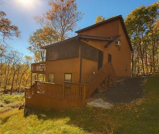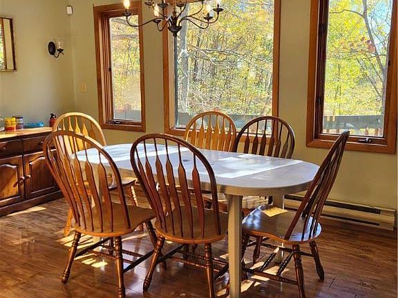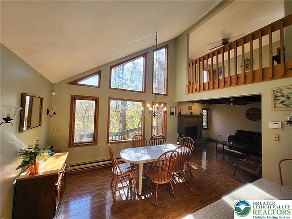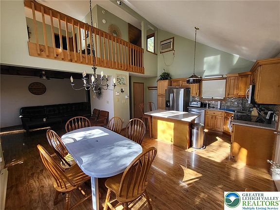 A gas fireplace in the living room and a wood stove on the lower level provide warmth and charm year-round. The layout includes one bedroom on the main floor, one on the lower level, and two on the upper level, with a full bathroom on each floor. A loft on the upper level offers additional versatile space that can serve as a sitting area, home office, or playroom.