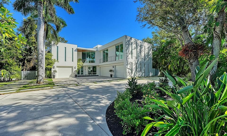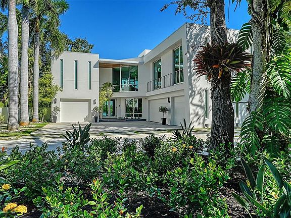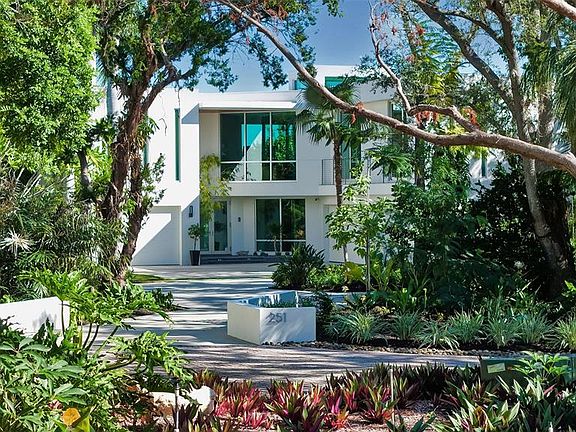 This award-winning Modernist home was designed to provide privacy while maintaining direct tranquil water views framed by mature tropical landscaping. Located in the coveted and private lot enclave of Cedar Park, one approaches the residence via a canopied private lane before entering the ideal spot for boaters, car enthusiasts, or those who just enjoy the serenity of the .6-acre grounds with +/-350’ of frontage on Cocoanut Bayou. The car enthusiast will appreciate the twin garages accommodating 5 cars, while boaters will be impressed by the water depth of +/- 4’ , substantial IPE wood dock with 10,000lb. and 7,000lb lifts, and immediate access to the Bay and Gulf. Designed with practicality and easy living in mind, the light filled rooms feature high ceilings, wall to wall stacking glass doors, a chef’s kitchen with Miele appliances and Italian cabinetry, elevator, generator, and an open concept plan that transitions seamlessly between indoor and outdoor living spaces. Enjoy outdoor dining and relaxing on the expansive covered terrace, lounge by the very private 40' saltwater pool with spa or just drink in the tranquility offered by this special property. The split plan with 4 bedrooms (one makes the perfect office) and 3 and ½ baths allows for flexibility of use and manageable size. Private, gated beach access is available. This is the ideal home base to enjoy the island lifestyle and for you and yours to take advantage of all that Sarasota and Siesta offer. Set out by land or sea to enjoy the world-renowned sugar sand beaches, downtown cultural venues, museums, multiple restaurants, and shopping. An exceptional opportunity for the discerning.