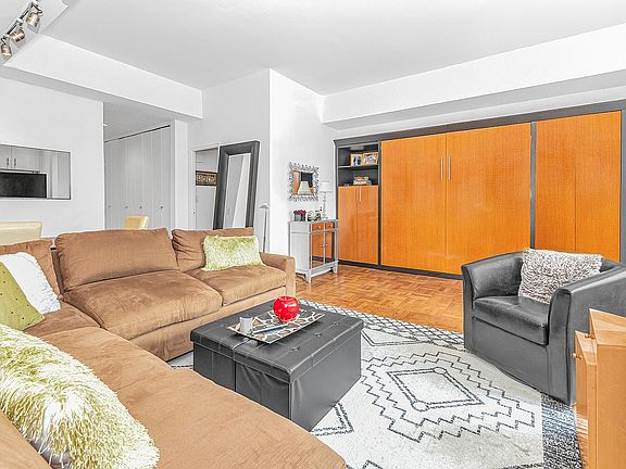This could be the best alcove studio in NYC! Sun-flooded from South and West exposures, and with beautiful open city views, including the Chrysler and GE Buildings and the stunning cobalt detailing of 1 Vanderbilt at night, this fabulous, one-of-a-kind Alcove Studio has soaring ceilings almost 10' high, 2 exposures and very generously proportioned rooms! This extraordinary home features a large Living Room with 3 south windows and 1 west window, an approximately 14' Sleeping Alcove with a gorgeous, custom built-in king-size Murphy Bed and Wall Unit with lots of storage, an updated Kitchen with a dishwasher, microwave oven and a pass-thru to the Dining Area, a large Dressing Room with enough space for a Home Office or Vanity and a separate Foyer. This very special, mint condition convertible Jr. 1 Bedroom has amazing closets, custom Roman shades and is ideal for an open layout. All of the equipment and beautiful furnishings may be available at an additional cost. Pictures don't do it justice. This is a must see!