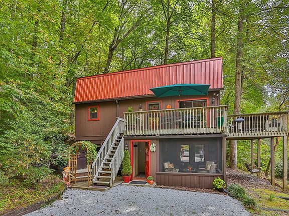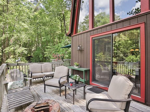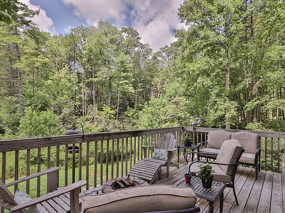 This comfy mountain cabin has everything you need in beautiful, pastoral Horse Cove. Just minutes from downtown Highlands, it features two bedrooms and two baths with good separation on three floors. Lots of outdoor space to enjoy both the mountains and a lovely pond across the road. You'll love looking at the stars from the warmth of the hot tub or cozying up to the fire pit on the deck. Inside you'll find a rustic feel with lots of wood, large windows to bring the outside in, and a cozy gas fireplace for cooler times. Off the downstairs bedroom is an additional room for an office, or whatever you want it to be, along with the screened porch. This peaceful abode comes furnished and ready to be your year-round home, vacation home or rental. A one-car carport with a small workshop room behind it adds to the appeal. The property adjoins National Forest. Easy on your pocketbook. (Zillow erroneously has this listed as 10/10 flood risk. Please disregard. Nothing is further from the truth!)