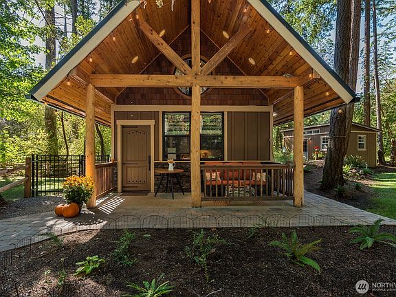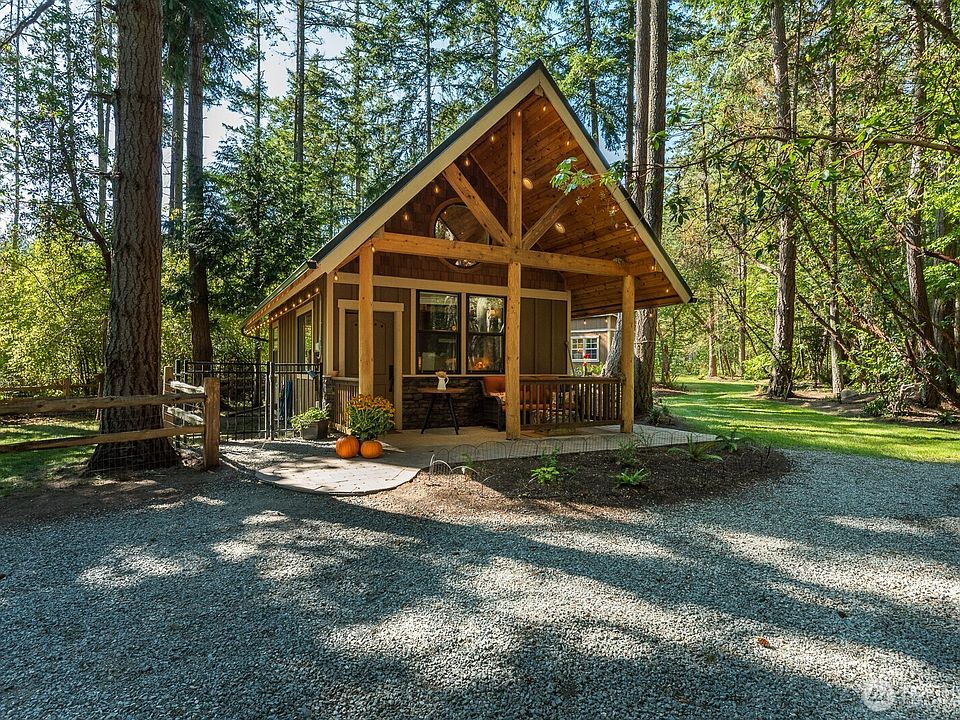 Quality-built home in a forested setting offers true privacy on a shy acre, across from the water. The level lot opens to a sunlit meadow and beautifully landscaped grounds w/ fenced garden and potting shed. A gated entry welcomes you to an impressive 37'x24' shop w/ two 30-amp circuits for a welder and heater, perfect for the car enthusiast. A massive Quonset hut provides additional space for boats, RVs, or larger projects. A cobblestone pathway leads to your private bathhouse, a unique retreat designed for relaxation. The main home features a gas fireplace, loft, and thoughtful designer touches throughout. Just 5 min. to dining, golf, and shopping. North-end Island for easy access with rare seclusion. Ideal VRBO or private retreat.