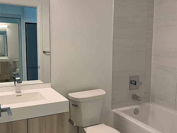 Floor-to-ceiling windowsEast exposureSleek stainless steel appliancesQuartz countertopsContemporary cabinetrySpa-like bathroom