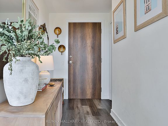 Welcome to this beautifully upgraded 2-bedroom, 2-bathroom condo offering 920 sq ft (including balcony) of thoughtfully designed living space with southwest exposure and sweeping views of Lake Ontario. Bright and modern, the open-concept layout showcases a sleek kitchen with a built-in coffee bar featuring porcelain counters and backsplash, an integrated flush fridge, flush cooktop, and undermount sink for a seamless designer look.The spacious living area opens to a private balcony, recently enhanced with custom paver tiles and outdoor pot lights perfect for entertaining or relaxing at sunset. Both bedrooms feature upgraded light fixtures with modern bedside sconces, creating a warm and elegant ambiance. With two generously sized bedrooms, the home is ideal for professionals or couples needing a dedicated work-from-home space. Added conveniences include in-suite laundry, two storage lockers, and a parking spot near the elevator with EV charging rough-in.The building offers resort-style amenities: outdoor pool, sauna, fully equipped gym, yoga studio, pet wash station, and 24-hour concierge and security.Unbeatable location steps from Mimico GO Station for an easy downtown commute, minutes to major highways, and a short walk to the waterfront trail for biking, running, or lakeside strolls. A perfect balance of urban convenience, lakeside tranquility, and work-from-home practicality.
