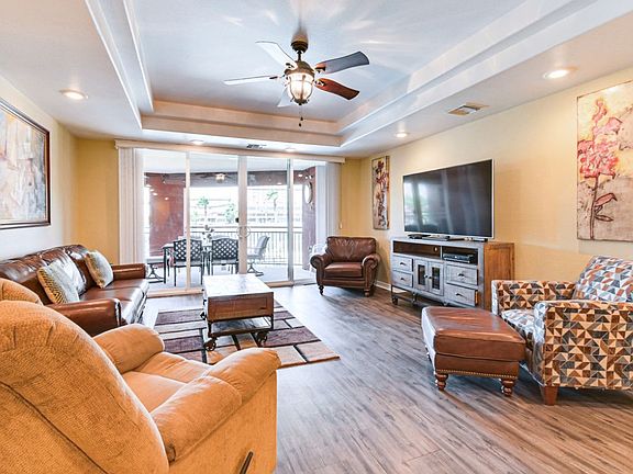 Located in the Colorado River condominiums on the beautiful Colorado river. This lower level unit comes fully furnished with all amenities included. Beautifully styled three bedroom two bath, has a large master on suit with a King sized bed and in the bathroom features a large jetted soaking tub, and 2 Large closets. The kitchen has an open style floor planned fully equipped with all the things you would need to make a gourmet meal or just a quick snack. Spacious living room with big screen TV, couch and oversized recliner for your comfort. Both spare bedrooms have large queen beds. The community features a large heated pool and spa with the water taxi that can pick you up from the boat dock can take you to the casinos. Owner pays all utilities with a Cap on the Electric