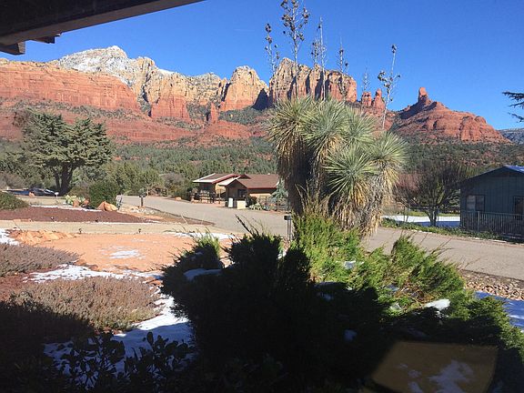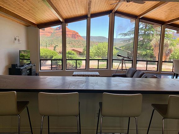 Fabulous uptown Sedona house in a very quiet area, on a .8 acre lot situated on a dead end street. It offers a spacious open floor concept, with cathedral ceilings and floor to ceiling windows. Boasts fantastic red rocks views from every room in the house. Finished with a sleek glossy concrete flooring through the house. The large living room and the large dinning room open to the bright kitchen and are adjacent to a second seating area with glass doors opening to the patio and backyard. It makes the perfect space to entertain, enjoy the views of the mountains on one side and the backyard on the other. Custom steel counter between kitchen and living room with exquisite views of the red rocks. The kitchen includes all appliances and offers plenty of counter space plus an island. The split plan has a very spacious master bedroom, with a large walk in closet and a large, airy master bathroom with two separate vanities and walk in shower and skylight. The second and third bedrooms on the opposite side of the house, provide big closets and a roomy second bathroom with tub/shower combination and skylight. Extra closets designated for linen and coats usefully placed. The laundry room has a full size washer and dryer, sink and cabinet. A big covered patio borders the full length of the back of the house and it is followed by a big backyard. The car garage has comfortable space for two cars and plenty of extra space and shelves for storage. Adjacent to the garage there is a large office/studio space. The location is perfect at walking distance to trails for biking, hiking and running; very quiet but still set just a few blocks to enjoy restaurants and shopping. Contact owner, Edith Long term rent. Not accepting: short term rental, "corporate rental" of any kind. Tenant pays for all utilities but sewer. No smoking. Unfurnished.