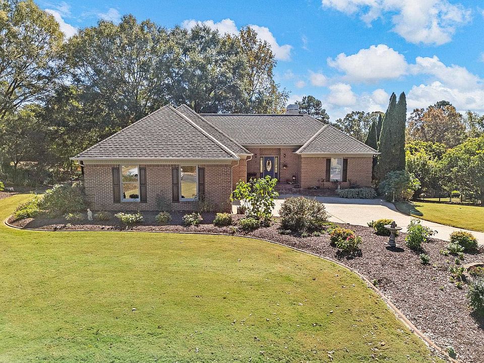 Welcome to this beautiful one-owner, all-brick 3-bedroom, 2.5 bath home perfectly situated on the 5th fairway in the highly sought-after River Falls Plantation, a Gary Player Signature Golf Community. This home offers an open floor plan, gleaming hardwood floors throughout the living, dining, kitchen and hallway areas, plus breathtaking golf course views from multiple rooms.  An extra-wide front stoop welcomes you with space for seasonal décor and planters, enhanced by motion-detecting lights for convenience and security. Step through the front door to find vaulted ceilings, recessed lighting, and a cozy gas log fireplace that anchor the living room. A built-in wet bar area makes this space ideal for entertaining or relaxing after a day on the course. There is room for guests to hang their jackets in the coat closet, then have a seat and enjoy the views!  The formal dining room features inlaid hardwood flooring and a sparkling crystal chandelier, creating a perfect setting for special dinners. The expansive covered deck overlooks the lush, landscaped backyard providing year-round enjoyment in a peaceful setting.  The primary suite offers private access to the covered porch, his-and-her closets, and a spa-like ensuite with dual sinks, a step-up jetted tub with waterfall faucet, separate shower, linen closet, and private water closet. The two guest bedrooms, one which is spacious enough to create a sitting or desk area and a full bath are conveniently located on the opposite side of the home for privacy.  The kitchen, which is open to a bright breakfast area, is both beautiful and functional, featuring refinished Cocoa Cherry cabinets, granite countertops, tile backsplash, walk-in pantry, and two additional storage closets. A nearby laundry closet with shelving adds extra convenience.  Need more space? The finished lower level includes a half bath and a flex space that can be customized to fit your lifestyle—whether it’s a media room, gym, or hobby area. The half bath can easily be converted to a full bath, making this ideal for guests or the teenager in the family.  This level opens to a covered patio and Aluminum fenced backyard (installed in 2024), with a separate entrance for golf cart storage and easy course access. The unfinished basement area offers endless potential for expansion or additional storage, complete with shelving and a walkout to the backyard. Several outlets to the crawl space makes access easier.   Let's not forget the energy efficient tankless water heater which ensures you will never run out of hot running water.  Outside, you’ll find a gardener’s paradise with Confederate Roses, Rose of Sharons, Butterfly Bushes, Lantana, Angel Trumpets, plus a variety of Hydrangeas, Hibiscus and more—truly a yard worthy of a “Yard of the Month” award!  You'll also enjoy the firepit, perfect for those chilly evenings.   Conveniently located near shopping, restaurants, medical offices, and major highways, this home combines comfort, elegance, and convenience—all within one of the area’s most distinguished golf communities.