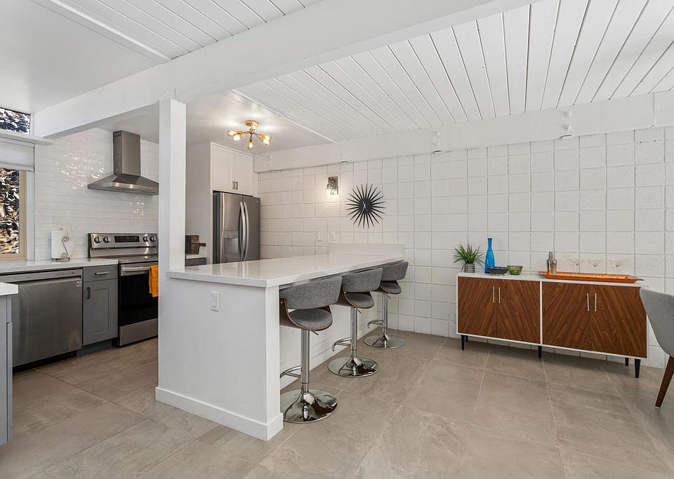 Contemporary upgradesMid-century modern charmLarge islandElegant finishesNatural lightQuartz countertopsStainless steel appliances