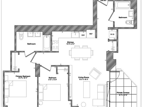 Luxury 2 Bedroom/2 Bathroom Apartment with a private terrace in a brand new Development! This unit features stainless steel appliances including dishwasher, in unit washer/dryer, individually controlled heating/cooling, hardwood floors, granite countertops, high ceilings, plenty of closet space, large windows, and video intercom.