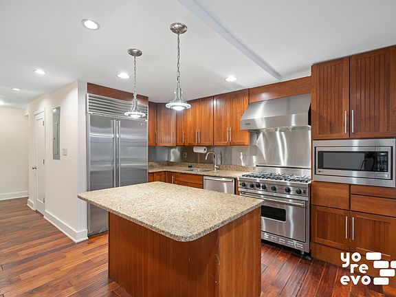 On the first floor of the apartment, 251 West 19th Street #1C features an oversized kitchen, complete with Subzero and Viking appliances, a large island, granite countertops, and tons of generous cabinet space.