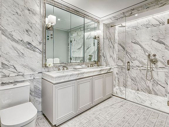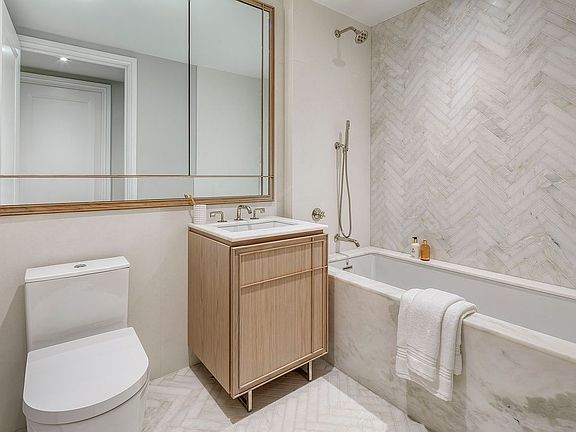 This spacious two-bedroom, two-and-a-half-bathroom residence on the southwest corner spans 1,447 square feet, offering ample space for your comfort. As you step into the gracious foyer, you’ll be greeted with white oak herringbone flooring, a spacious entry closet, and a powder room featuring Calacatta Gold marble flooring and accent walls. The open living room boasts large windows overlooking the surrounding treetops, providing a serene ambiance filled with natural light. The separate windowed kitchen is designed for both function and style, featuring crema delivato marble counters, white matte lacquer cabinets by Aster Cucine, and top-of-the-line Gaggenau appliances. Retreat to the luxurious primary bedroom with a four-fixture bathroom featuring Calacatta Gold and Thassos mosaic marble floors, slab walls, and a stall shower. The secondary bedroom faces west with access to the secondary bathroom featuring custom ceramic tile walls and flooring in a matte finish. Bianco Venetino marble clads the vanity top and tub surround. The stack washer and dryer are conveniently located in a separate closet.