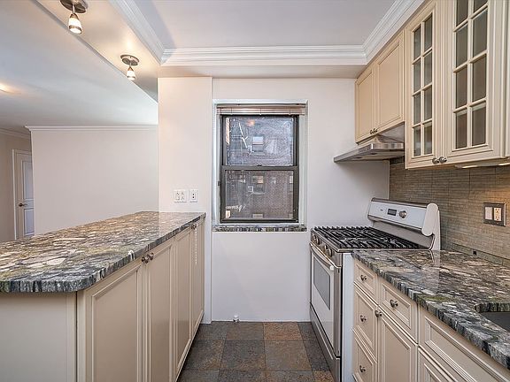 The oversized living room gets lots of natural light from corner exposures, complemented by overhead lighting and wall sconces. The remodeled gourmet kitchen features stone counters, wood and glass cabinetry, a mosaic tile backsplash, and pendant lighting over the dining/prep bar. The large bedroom boasts an entire wall of closet space with custom organizers. Also notable is the updated marble bath.