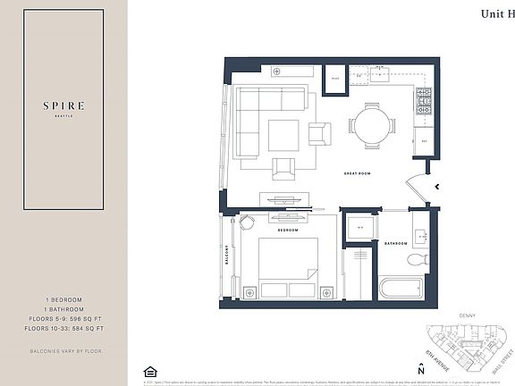Welcome home to Spire! This west-facing, sunset-view one-bedroom home with peak-a-boo views of the Sound and Olympic Mountains feels practically new and has been lovingly maintained. Features include Bosch appliances, L shaped kitchen, floor-to-ceiling windows in the living and bedroom areas, hardwoods throughout, and a spacious, spa-like bathroom. Spire offers premier amenities across three levels—rooftop fitness center, private dining spaces, and an expansive wraparound terrace with nearly 360° views and a building staff that is loved by the residents. Perfectly located near South Lake Union, Belltown, and Queen Anne with easy access to Seattle’s best dining, shopping, and entertainment.