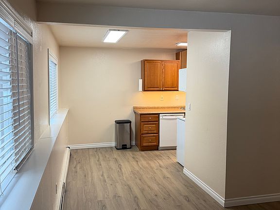 Inside, you'll find modern wood-style flooring, fresh paint, and updated fixtures throughout. The kitchen offers plenty of cabinet space, clean appliances, and a functional layout that opens to a bright living area. Both bedrooms feature large windows and ample closet space, and the bathroom has been fully refreshed with new finishes.