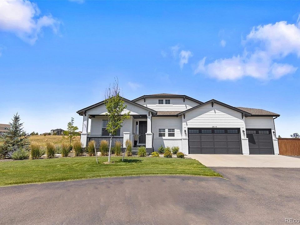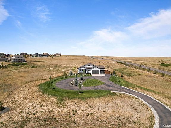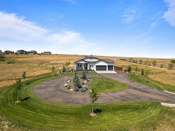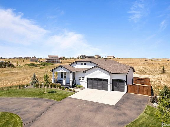 Welcome to Elkhorn Ranch a gorgeous 5 acre community, here is your chance to own a piece of paradise. This home is ideally situated on a private cul-de-sac with spectacular views. From the moment you walk in you will notice a spacious open floorplan, step into a chef's delight, gourmet kitchen offers oversized Calacatta Gold Quartz countertops with waterfalls on both ends, upgraded cabinetry, top of the line kitchen appliances from LG Signature collection, double oven, JennAir 6 burner gas range, a butlers pantry, and lavish hardwood flooring. The great room features a beautiful floor to ceiling stack stone fireplace, enormous windows with Plantation Shutters throughout, flooding in tons of natural light. The Primary Suite is unsurpassed for luxury in a ranch home, with a sitting room and a 5 piece ensuite bath with 2 split granite slab vanities, tiled shower with bench, soaking tub, and your dreamy huge custom California walk-in closet with direct laundry room access. A second bedroom with full ensuite bath & third bedroom or formal study with classic French Doors complete the main level. Walk downstairs to find your 2700+ sq ft basement with egress windows which is ready for you to finish out and complete your dream home. The garage is over-sized and has room for three cars, plus plenty of space for a workshop, ATV or motorcycles.. You will find NewAge Storage Lockers, epoxy coated floors, and a mezzanine perfect for extra storage. Over $95k in landscaping design, trees, high efficiency irrigation system, and electrical infrastructure.. built to be ready for expansion. Elkhorn Ranch is an amazing location... Country living at its finest with city amenities just 10 minutes away, but with plenty of space for you to spread out and enjoy your land with great views and wildlife abound. Horses are allowed. Come see this home today, you will not be disappointed!