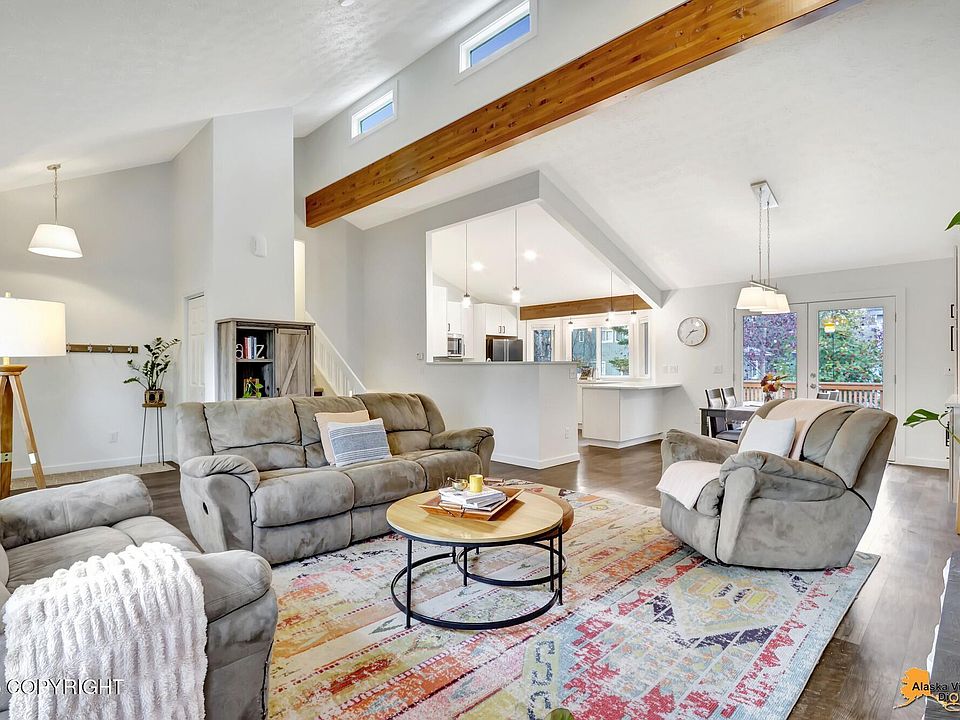 Thoughtfully updated throughout, this south ANC tri-level blends modern style with functional design. The main floor Great Room features soaring ceilings, an updated chef's kitchen, open dining, and a spacious living room with a cozy wood-burning fireplace--perfect for entertaining. Two versatile secondary family rooms offer endless possibilities for guests, hobbies, office, playroom, or home gym. 2-car garage, nearly 200 SF of detached shed/shop space, an expanded multi-level deck, and a sun-filled south-facing fenced yard are ideal for BBQs and Alaskan living. With numerous updates including triple-pane windows, roof, mechanical, flooring, and fresh paint and carpet, this home is ready for you to make it your own!