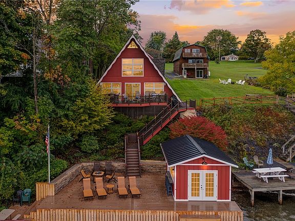 Impressive lake property offering two dwellings on Skaneateles Lake, only a few miles outside the village on the west side. The carriage house recently gutted and renovated offers sweeping views of the lake, two bedrooms on the main level, full bath with tiled shower, vanity, washer and dryer, nice eat-in kitchenette with granite countertops, custom cabinets, and family room. The second level is an oversized loft with four built-in bunks all have docking stations for your devices, built in drawers, built in closets, and t.v and sitting area. The A Frame offers an open floor plan with, granite kitchen, walk-in pantry, dining area, two living areas one with gas fireplace, and built-in shelves with striking views of the lake, The second level has two bedrooms, full bath with tiled shower. The deck off the main living area is a great size for relaxing and entertaining. The newly totally renovated waterfront (2022) offers large permanent docking systems, trex decking, amazing boat house with refrigerator, cabinets, hanging hooks for paddle boards/canoes. Oversized window that opens up fully to the deck and offers an area for drinks and food to fully entertain at the waterfront.