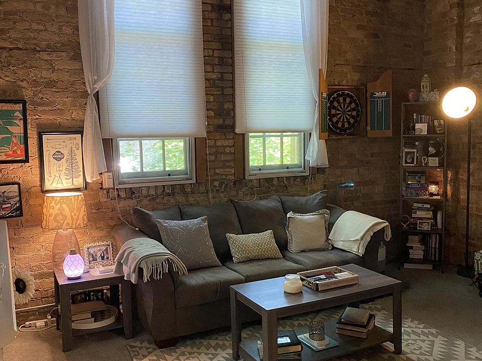 Gas fireplaceTree-lined streetCozy lofted bedroomsRooftop deck with grillExposed brickUpdated bathroomArched windows