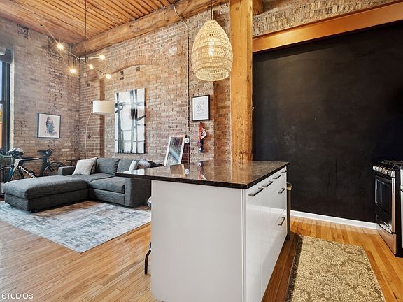 Prime Lincoln Park 1 bed / 1 bath timber loft unit with tons of character in The Wheelworks Condominiums! This rare top-floor, modern unit features 12' soaring ceilings, dramatic exposed brick to die for, and hardwood floors throughout. Deeded, secure remote gated parking is also included in the price! The newer kitchen has been totally redone and features beautiful granite countertops, an undermount stainless sink, custom cabinets, subway tile backsplash and stainless steel appliances. The kitchen island plays nicely into the unit's open floor plan featuring a wood burning fireplace, updated tiling and fireplace mantle. Custom built in features allows for tons of storage and a discreet in-unit stackable washer/dryer (to the right of the refrigerator). Bedroom large enough for a queen bed + office/work from home space. Bathroom renovated and has an updated vanity with under cabinet storage + medicine cabinet mirror and a stand up shower. Large windows allow for great natural light. Additional overhead storage cubby in the unit + one private storage locker included as well. The Wheelworks building also features a common roof deck, recently renovated with trex decking and new railings in 2024 with amazing views of the city skyline, a courtyard garden and patio and a bike room. Don't miss your chance to live in one of Chicago's most coveted neighborhoods. Steps from public transportation, DePaul, Wrightwood Park and Avli Taverna Greek restaurant and Starbucks steps away.