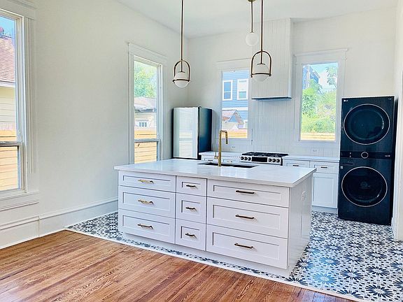 The home features hardwood floors throughout, 12 foot ceilings, plenty of natural light, designer kitchen w/ quartz countertops, gas stove, oven, and LG washer & dryer. Fully fenced private yard and front gate.