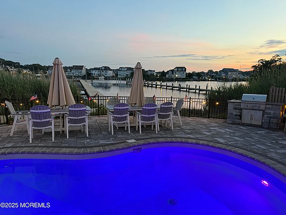 Enter into this elegant 3,500 sq ft custom, luxury home with newly renovated dock! This gorgeous home includes 5 bdrms, 3 full renovated baths & 2 car gar w/ new epoxy floor, Gourmet kitchen boasts Thermador appliances consisting of 6 burner stove, double oven + wall oven, 2 inductions , 2 dishwashers & subzero refrigerator. Kitchen also features dinette area & wet bar. Dining rm w/vaulted ceiling & fireplace. The open Family rm has NEW gas fireplace. 5th bdrm currently used as office/den. Huge Primary bdrm offers a balcony overlooking the open water along w/ a primary full bath w/ NEW RADIANT FLOOR, Dock your boat & relax in the Tranquil yard enjoying an inground saltwater heated pool w/ waterfall, nat gas grill & 1 yr gas firepit. Seller has invested over $250,000 in upgrades Point Pleasant beach club passes are Grandfathered to the house. The perks of the beach club is a place to keep your chairs & umbrella, a secured locker, bathrooms, and sometimes waitress for drinks. Additional features of the home include 4 additional spacious bedrooms (one on main level with separate bath and the other 2 upstairs with a Jack and Jill bathroom. 3 zoned gas heat (1 baseboard and 2 forced air). 2 zoned Central AC, Family room features Bose surround sound. There is an incredible amount of storage along with pull down stairs. Irrigation system, Outside lighting, Solar panels are owned not leased, which are income generating of approximately $350 per month with selling of the credits. Split Riparian Rights of $4,000/ year are only $995 per year. This house has it all!!!