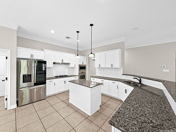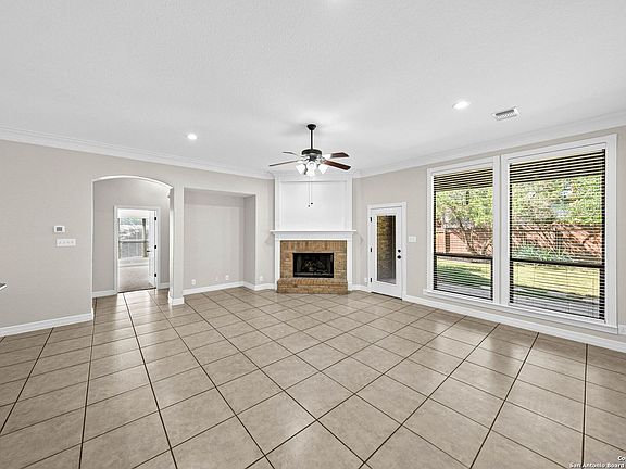 Set within the charming, gated community of Belterra, this single-story gem sits proudly on a corner lot, radiating curb appeal with its all-brick exterior and inviting covered porch. From the moment you approach, you will notice the tall, richly stained wood door with an ornate glass feature that sets the tone for what awaits inside. The foyer makes an impression with its spacious feel, high ceilings, and 18x18 tile that gives the space a clean and polished look. To your right, a private office with French doors and large bay windows creates the perfect work-from-home haven or a quiet space to focus. Across the hall, a dedicated dining area makes hosting family dinners or holiday gatherings effortless, positioned perfectly next to the kitchen. The kitchen is where this home truly shines. Designed for both everyday function and entertaining, it boasts granite countertops, stainless steel appliances including a refrigerator, and a 5-burner gas cooktop. The center island provides extra storage and electrical outlets for meal prep or baking days, while bar seating and a built-in breakfast nook with bench seating make casual meals a breeze. A generous walk-in pantry keeps everything organized and close at hand. The open-concept living room is the heart of the home, anchored by a gas-burning fireplace that invites you to settle in on cooler evenings. Large windows flood the room with natural light and provide a view of the backyard, while direct access to the covered patio makes indoor-outdoor living seamless. The oversized primary suite feels like its own retreat. With soft carpeting underfoot, bay windows that bring in morning light, and a ceiling fan for comfort, this room is made for unwinding. The en suite bathroom is spacious and well appointed, featuring dual vanities with an oversized mirror, a jetted soaking tub for end-of-day relaxation, a separate tiled shower, and a walk-in closet large enough to keep everything organized. The three additional guest bedrooms each come with walk-in closets, ceiling fans, and large windows, offering plenty of space for family or visitors. They share a thoughtfully designed Jack and Jill bathroom with dual and single vanities, plenty of storage, and a tub-shower combo with tile surround. Practical touches like the utility room with full-size washer and dryer connections, cabinetry, and an extra storage closet make everyday chores easier. Step outside to the covered back patio with embellished tile and pull-down shades, perfect for quiet coffee mornings or weekend barbecues. The level, fenced-in yard offers privacy and space to play, and the two-car attached garage adds convenience. Living here means access to controlled neighborhood gates, a community pool, a barbecue area, and a playground. All of this within the highly rated Comal ISD, making it a wonderful place to call home.