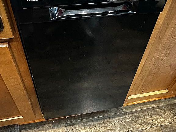Premium Appliances: Full-size residential LG front-loading washer and dryer, compact in-cabinet Frigidaire dishwasher, and a black Whirlpool stove and oven for all your culinary needs.