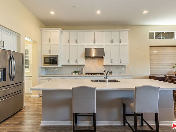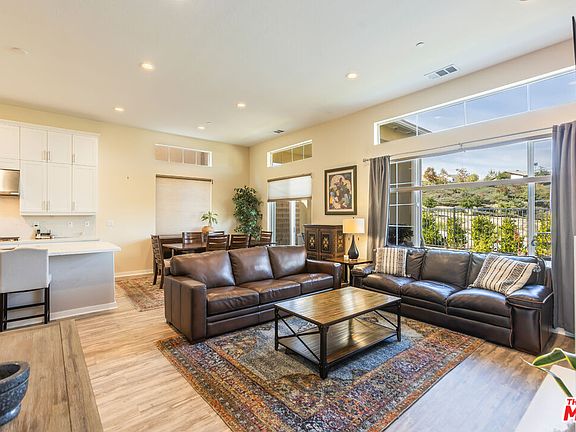 Nestled in the scenic hillsides of Canyon Country, this single-story home is located within the desirable guard-gated 55+ Verano community and offers 2 bedrooms, 2.5 bathrooms, and over 1,600 sq. ft. of thoughtfully designed living space. Situated in a prime pocket of the community, the home is one of few with a completely open backyard and no rear neighbors. At the heart of the home is an open-concept living area with a fireplace, high ceilings, and large windows that fill the room with natural light. Perfect for a family or those who love to entertain, the kitchen opens to the living room and is complete with recessed lighting, stainless steel appliances, quartz countertops, double ovens, a wine fridge, a walk-in pantry, and a butler's pantry. The bar-top island and adjacent formal dining area provide plenty of space for additional seating. The floor plan features two spacious bedrooms, both with en-suite bathrooms. The primary suite includes a walk-in closet, dual vanities, and a walk-in shower. Additional features include a powder room, a separate laundry room with a sink, a 2-car garage with built-in storage, and solar panels. Outside, enjoy a beautifully landscaped backyard with artificial turf and a covered patio area. The Verano community offers an array of amenities, including a pool and spa, fitness center, clubhouse, outdoor lounge and dining areas, walking paths, and more.