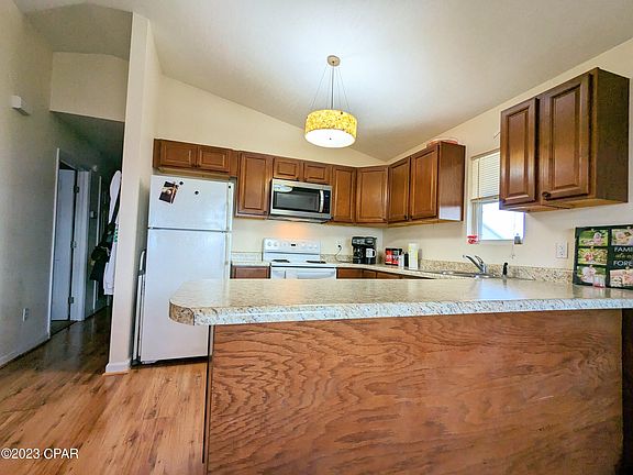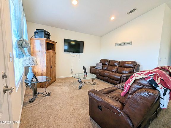 The open floorplan home has cathedral ceilings in the kitchen, dining, and living room. The floor plan is well thought out with the large room sizes and oversized closets. The rooms have ceiling fans and recessed lighting. This charming home is low-maintenance with metal roofing and hardi-board siding. The carport has an access door straight into the kitchen area, making it a breeze for unloading groceries without getting wet. The concrete driveway and concrete sidewalks add a nice finishing touch to this comfortable home. Some of theHome furnishings are available. The microwave vent a hood is new as well as the dishwasher. Buyers and sellers to split title evidence and doc stamps.