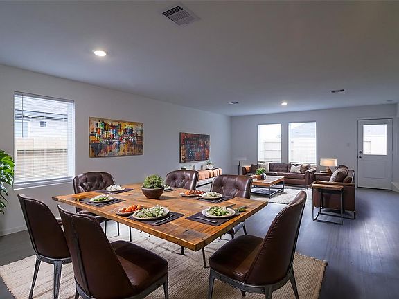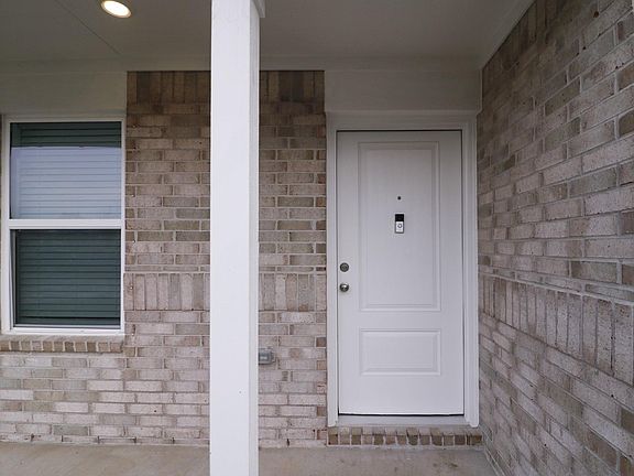 This single-story brick home features four bedrooms, two full bathrooms, and an open-concept layout connecting the kitchen, dining, and living areas. The kitchen includes a center island and ample cabinet space. The primary suite offers a walk-in closet and dual-sink bath, with secondary bedrooms located separately for added privacy. The home includes a two-car garage, covered entry, and fenced backyard. Located within the Cantera Creek community, which offers a swimming pool, splash pad, playgrounds, pavilions, walking trails, and outdoor recreation areas including courts and open green spaces.