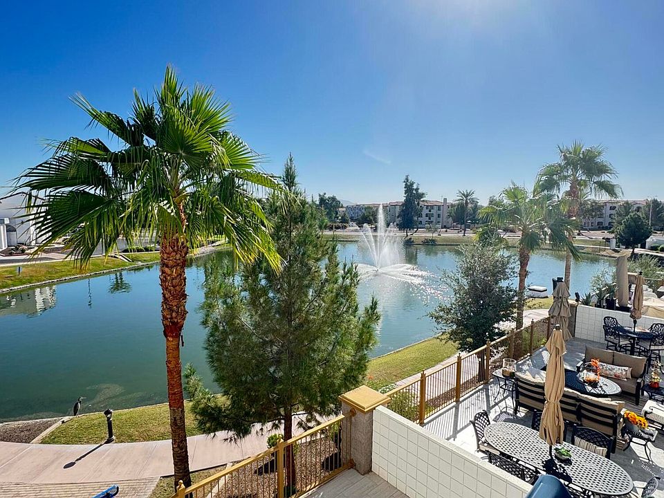 Situated by a lake with a large fountain, this condo offers picturesque views of San Tan Mountain, creating a serene and scenic environment.